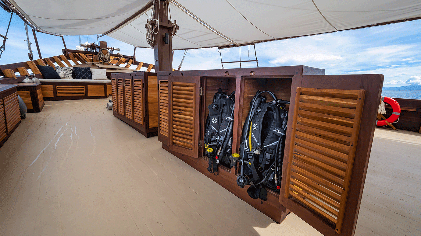 Upon arrival, our crew will be ready to greet you at the arrival hall. If you are staying in a hotel before your trip, we will arrange a pick-up from your hotel lobby for embarkation. After a warm welcome aboard, you'll have time to explore the stunning surroundings, lunch, setting the stage for the unforgettable days ahead. Then we will sail west, where you can enjoy the beach, snorkelling or diving on the islands of Bidadari or Sebayur Kecil. A sense of calm reigns on these islands but underwater the coral reefs are bubbling with life. To end the day, relax with an aperitif while admiring the beautiful sunset. Night diving is optional.