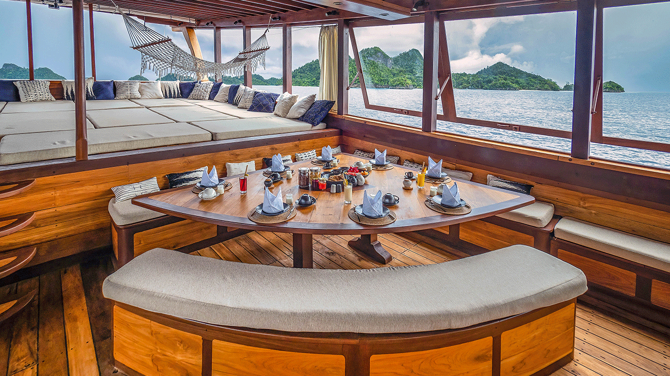Welcome aboard! Upon arrival, our crew will be ready to greet you at the arrival hall. If you are staying in a hotel before your trip, we will arrange a pick-up from your hotel lobby for embarkation. After a warm welcome aboard, you'll have time to explore the stunning surroundings, lunch, setting the stage for the unforgettable days ahead. Following lunch, the vessel will be close to arriving at your first destination. Pulau Saonek Kecil sits at the entrance to the park and is a great introduction to the potential marine life and scenic encounters you can expect for the rest of your ourney. Depending on the weather conditions the cruise may start from the north or south. In this sample itinerary we will head south first.